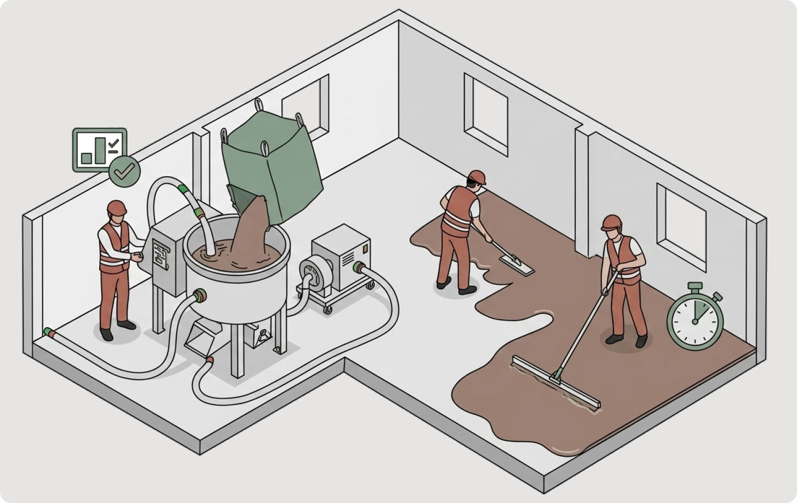 24 Stunden nach Einbringung begehbar, geringe Baufeuchte für rasches Austrocknen – besonders hilfreich in Altbau, Sanierung und Holzbau.